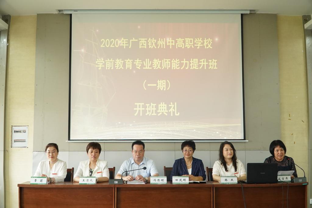 2020年6月8日上午,2020年钦州中高职学校学前教育专业教师能力提升班(一期)在钦州幼儿师范高等专科学校隆重开班。徐州幼儿师范高等专科学校到校实地送培,培训时间为5天。徐州幼专王清风、曹莉、韩燕、胡雪芬、高子砚、苏骏文等专家出席开班仪式。钦州市教育局党组成员、副局长冯思明出席开班仪式并作重要讲话??嘁鞘接汕罩菔薪逃值匙槌稍?、副局长、钦州幼儿师范高等专科学校法人代表田茂群主持。
