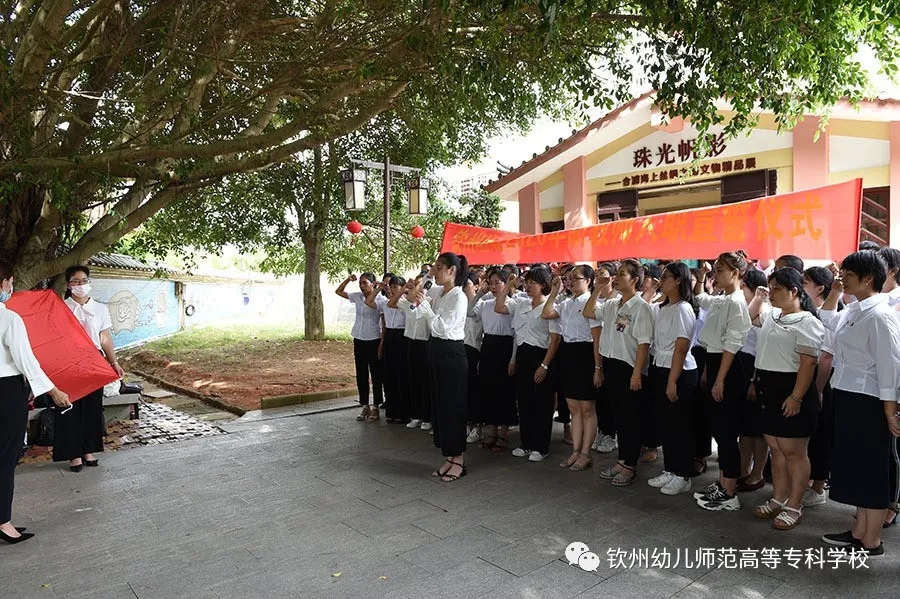 立德树人是教育的根本任务。习近平总书记在2014 年教师节前夕同北京师范大学师生代表座谈时,提出了做党和人民满意的好教师要有理想信念、道德情操、扎实学识和仁爱之心。随着社会经济发展,科学技术突飞猛进,国际竞争日益激烈,价值观念日趋多元化。如何加强新时代教师队伍建设,促进新教师实现角色转换,增强教师职业使命感、荣誉感和社会责任感,这是摆在我们面前的重要课题。为了引导和激励教师乐从师、为人师、做名师,树立健康向上的职业理想,积极投身教育事业,做新时代“四有”好老师,2020 年 7 月 17 日下午,钦州幼儿师范高等专科学校新教师入职宣誓仪式,在合浦汉代文化博物馆举行。钦州幼专校领导及60 余位新教师参加了宣誓仪式。