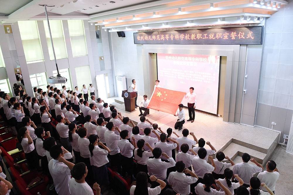 “忠于党的教育事业,贯彻党的教育方针;坚定政治理想信念、追求高尚道德情操、储备专业扎实学识、常怀教育仁爱之心;履行教师神圣职责,严谨修身治学,传承人类文明;为学生的全面发展,砥砺前行,为办人民满意的教育,奉献奋斗!……”,在钦州幼儿师范高等专科学校苏俭同志的领誓下,钦州幼儿师范高等专科学校全体教职工面对国旗庄严宣誓。