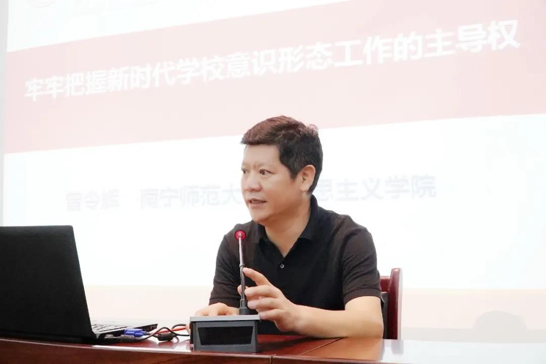 二级教授、博士生导师、广西高校思想道德修养与法律基础课首席专家、南宁师范大学马克思主义学院院长曾令辉教授作了《牢牢把握新时代学校意识形态工作的主导权》专题讲座。曾教授从新时代学校意识形态工作的时代特征分析、新时代学校意识形态面临的风险分析、把握新时代学校意识形态工作主导权的基本策略三个方面深入浅出地进行阐述和分析,指出学校意识形态工作和育人最大的时代背景就是新时代 。在对新时代的内涵进行充分解读后,提出新时代要培育“三有人才”;指出学校意识形态风险是指在办学管理和育人过程带来的一种损失的不确定性,如办学思想、办学方向、办学定位、学校文化建设、教育教学等方面诱发的意识形态安全等问题 。最后,就如何把握学校意识形态工作主导权提出了策略:(一)学校意识形态工作总体目标是:守住“四个为”的底线,强化“四个”坚持。坚定“四个认同” ,实现“四个”统一。(二)在内容把握上,要把“两个巩固”作为意识形态工作的根本任务。(三)在方式方法上,应在知识认同转化为政治认同的环节上下功夫,从过去的说教式、传达式手段中转变过来,改空洞说教、硬性灌输为平等对话、软性渗透,双向交流、真诚沟通。(四)在工作布局上,要注重主渠道和广覆盖并重。(五)巩固学校意识形态阵地建设。人在哪里,阵地就在哪里,工作重点就在哪里。(六)打造人才队伍。分类指导、适度倾斜,配齐建强思政党务工作队伍。曾教授的讲座让我们对新时代意识形态工作有了更加深刻的认识,为下一步做好学校意识形态工作奠定扎实基础。