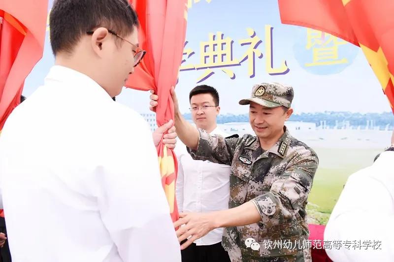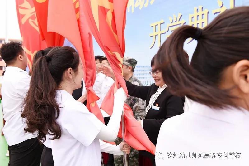 旗帜就是方向,旗帜就是力量,旗帜就是荣誉。钦州幼专各班班主任上主席台接受学校领导、部队领导授予班旗。