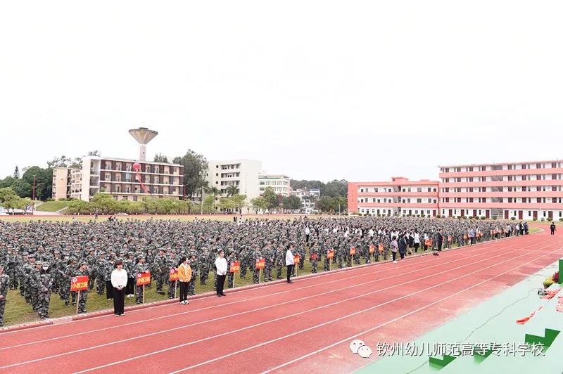 梁校长宣布钦州幼儿师范高等专科学校2020级新生开学典礼暨军训动员大会结束,各教官组织各班开始军训!