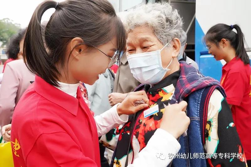 学生志愿者给来访离退休教职工佩戴钦州幼专校徽