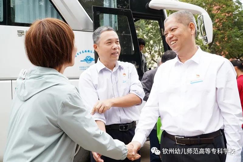梁燕清校长(右1)、颜循泽副校长(左1)迎接来访离退休教职工