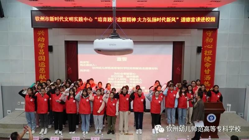 2020年 12月 9 日,我校隆重举行钦州幼儿师范高等专科学校无偿献血志愿者分队挂牌仪式暨钦州市“培育践行志愿精神,大力弘扬时代新风”道德宣讲报告会。仪式由校团委李琛琛老师主持,200名学生志愿者参加,在全体师生的积极配合下,活动顺利进行?;疃目勾俳松缁峋裎拿鹘ㄉ?发扬了服务群众的志愿精神。