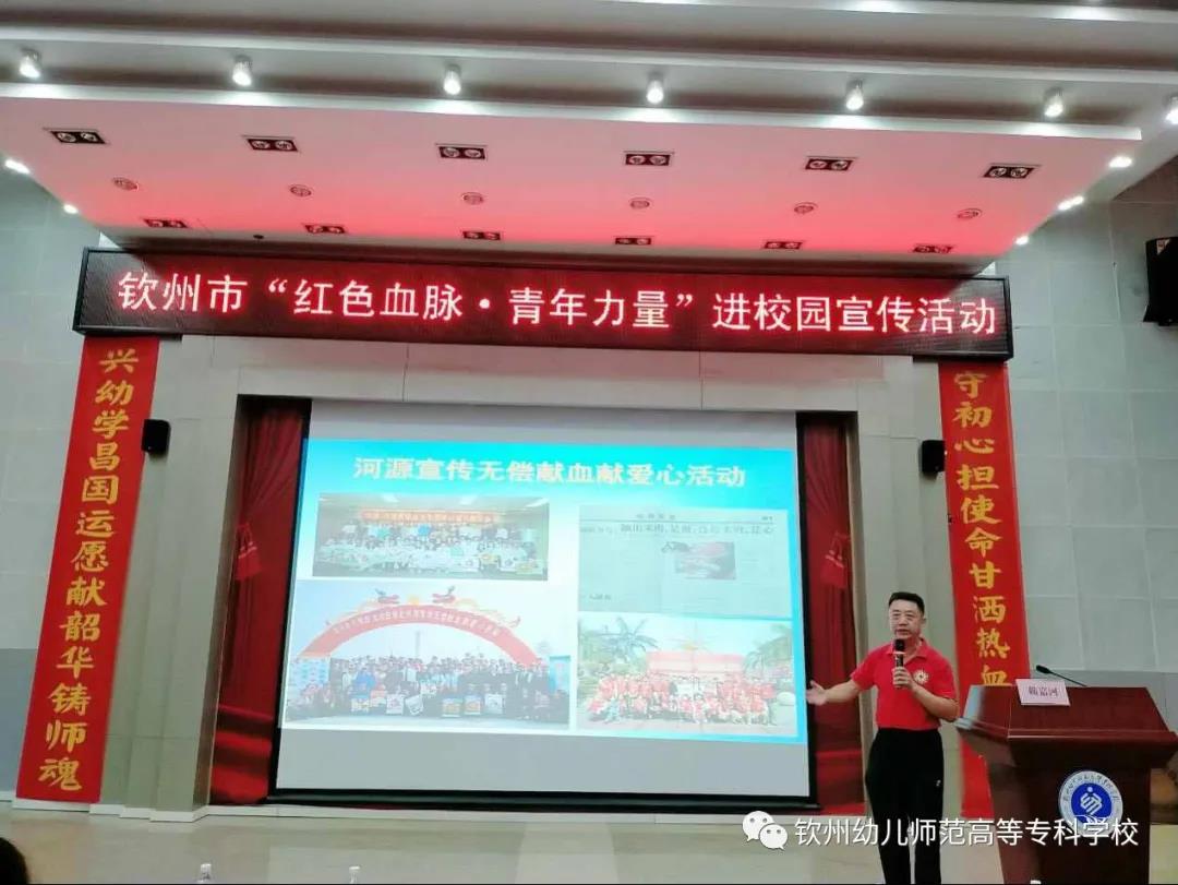 梁琳,钦州市无偿献血志愿者协会会长,是钦州市献血量最多的人!师生认真地观看梁琳会长宣传视频。