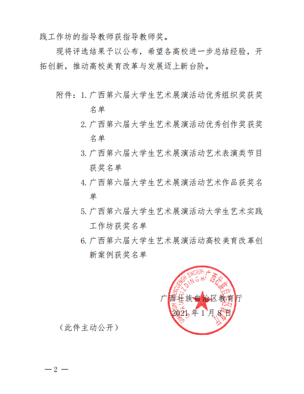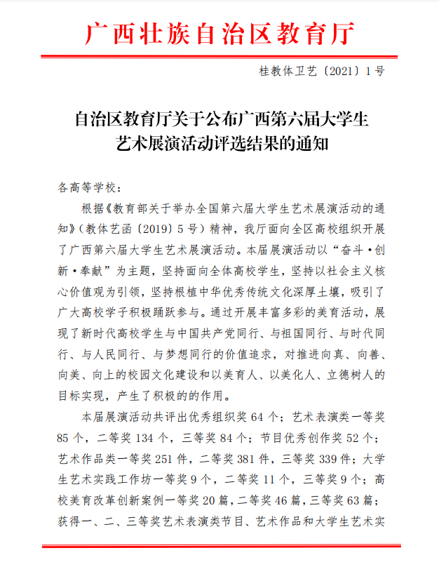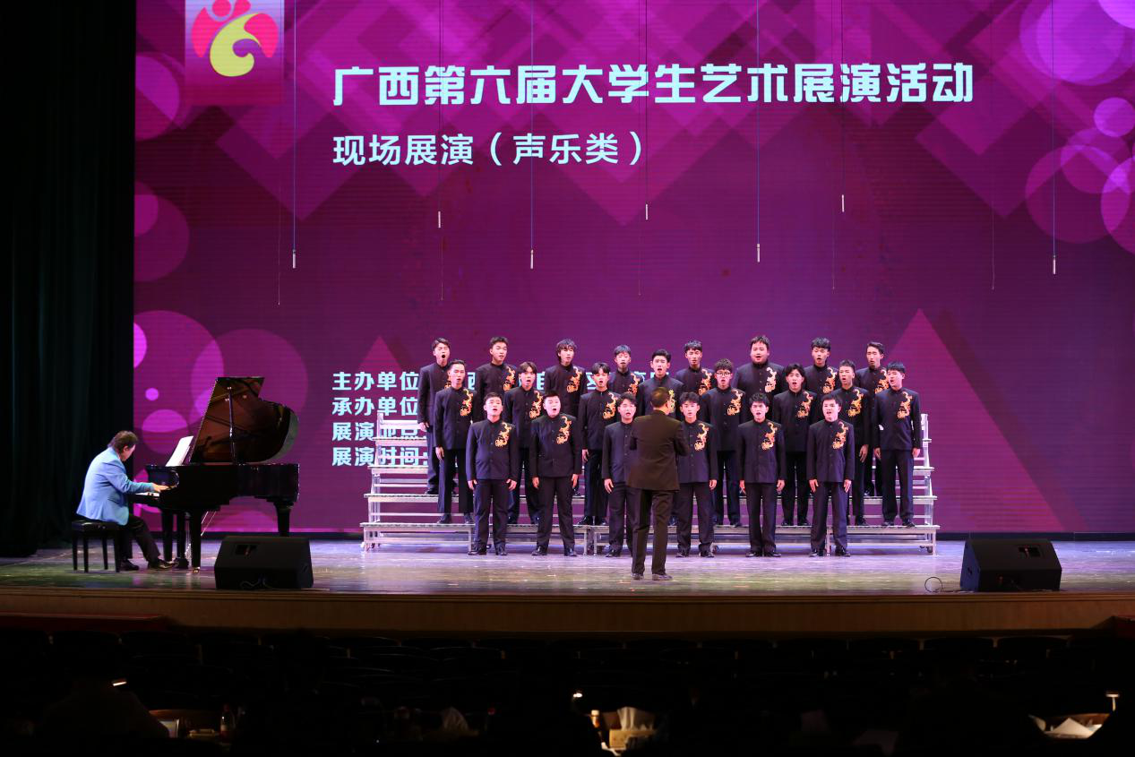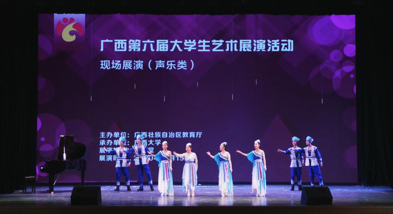 2020年12月19日,由广西壮族自治区教育厅主办、广西大学承办的广西第六届大学生艺术展演活动隆重启幕。在校领导的大力支持下,我校艺术系报送的声乐节目合唱《丝路驼铃》、表演唱《赶?!反尤?4所高校的共计303件艺术表演类作品初评中脱颖而出,入围本次现场展演,经过激烈的角逐,我校报送的两个节目均获得了声乐类乙组(专业组)二等奖,学?;竦糜判阕橹薄?/p>