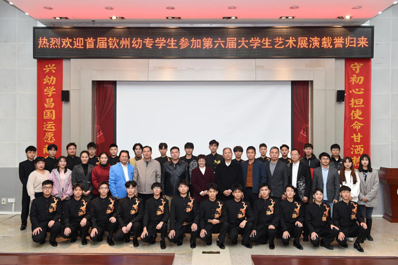 在此次展演中,面对实力强劲的兄弟院校,钦州幼专首届学子“初生牛犊不怕虎”,展示出良好的精神风貌和专业素养。在每一个优秀作品的背后,是老师和学生们的辛勤付出和努力。2020年10月8日我校正式开学迎来第一届新生。艺术系老师廖钊、庞波涛、黄解章、唐书群在收到比赛文件后,马上组织选拔学生、确定参赛节目,在不到一个月时间内,利用军训和上课之余加班加点地给学生排练,最终入围现场展演并获得佳绩。