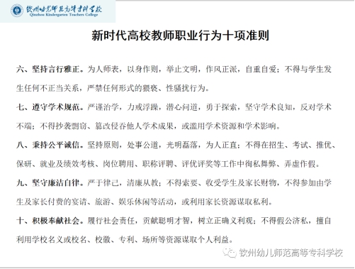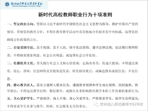 “一、坚定政治方向。......十、积极奉献社会?!?月27日,钦州幼专2021年春季学期开学工作布置会在全体教职工重温《新时代高校教师职业行为十项准则》的铮铮誓言中拉开序幕。