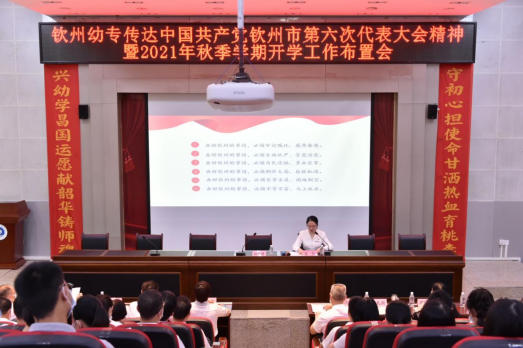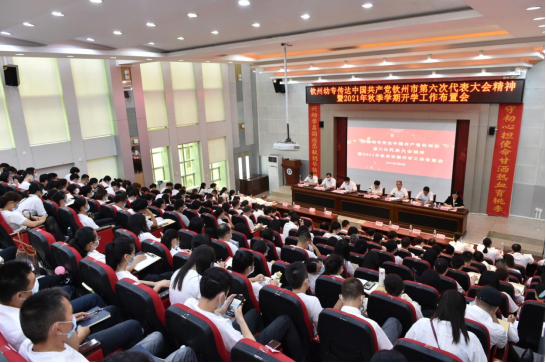 2021年9月2日上午,钦州幼儿师范高等专科学校在5号教学楼楼东边报告厅召开传达中国共产党钦州市第六次代表大会精神暨2021年秋季学期开学工作布置会。市教育局党组成员、副局长,校党委书记田茂群主持会议并讲话;校党委副书记、校长梁燕清作工作部署。