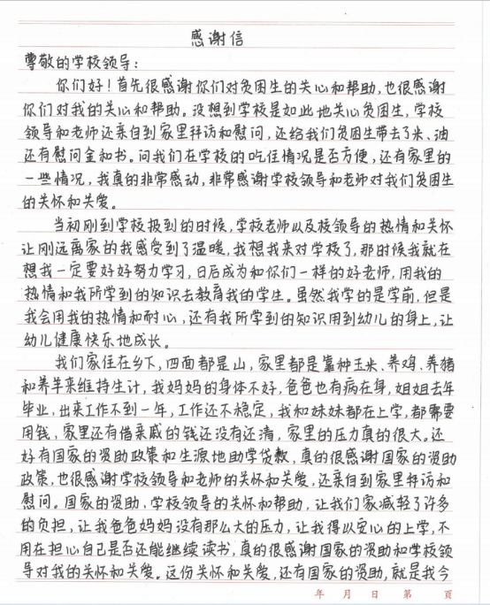 2021年9月6日是我校2020级学生回校正式上课的第一天,一大早,我校资助办就收到了一封特殊的来信——来信字体工整有力,内容情真意切,深深表达了对国家资助政策和学校领导老师的感恩之情,以及立志成为一名好老师的坚定志向,令人感动。这封信的主人是我校学前教育专业的小蒙同学,一位来自河池的农村女孩,是今年暑假我校领导上门走访慰问贫困生代表。