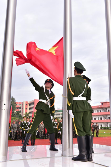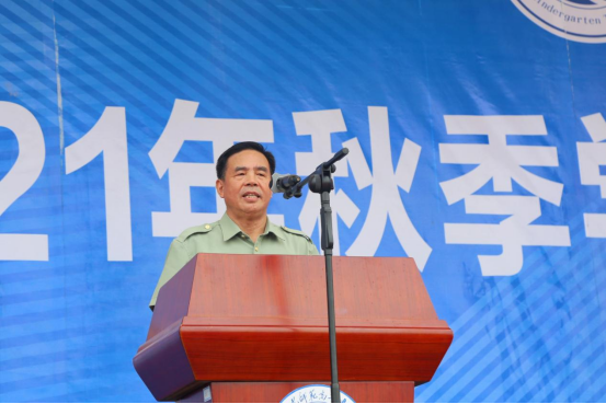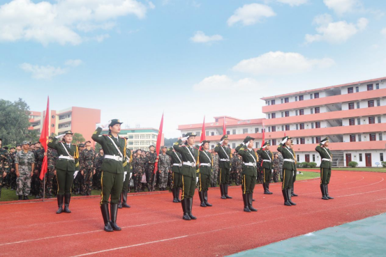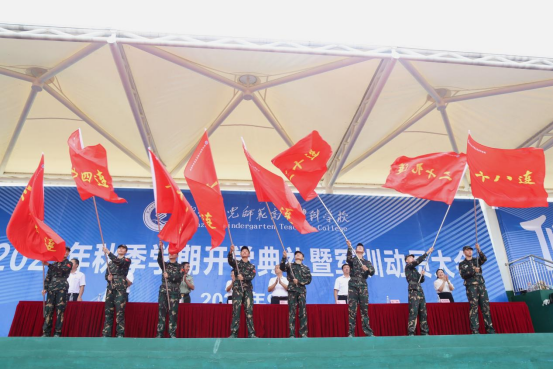 军训动员大会上,三军联创学生军训基地董事长杨政耀致辞。学校领导为各连队授旗。