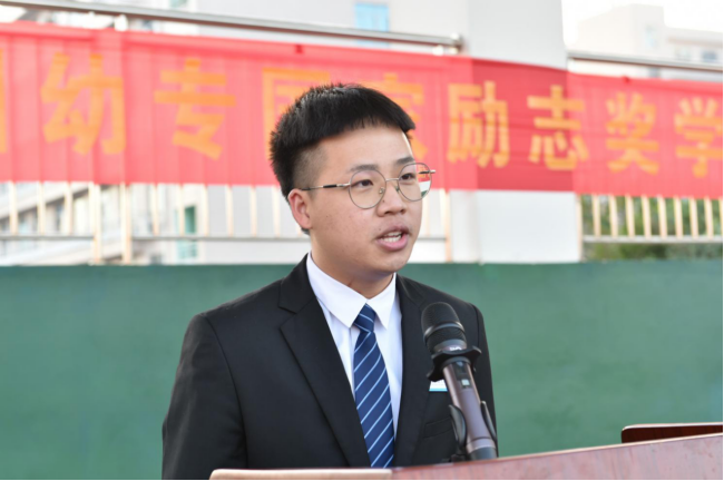 小学教育专业20(5)班周宏杰代表奖学金获得者发言。