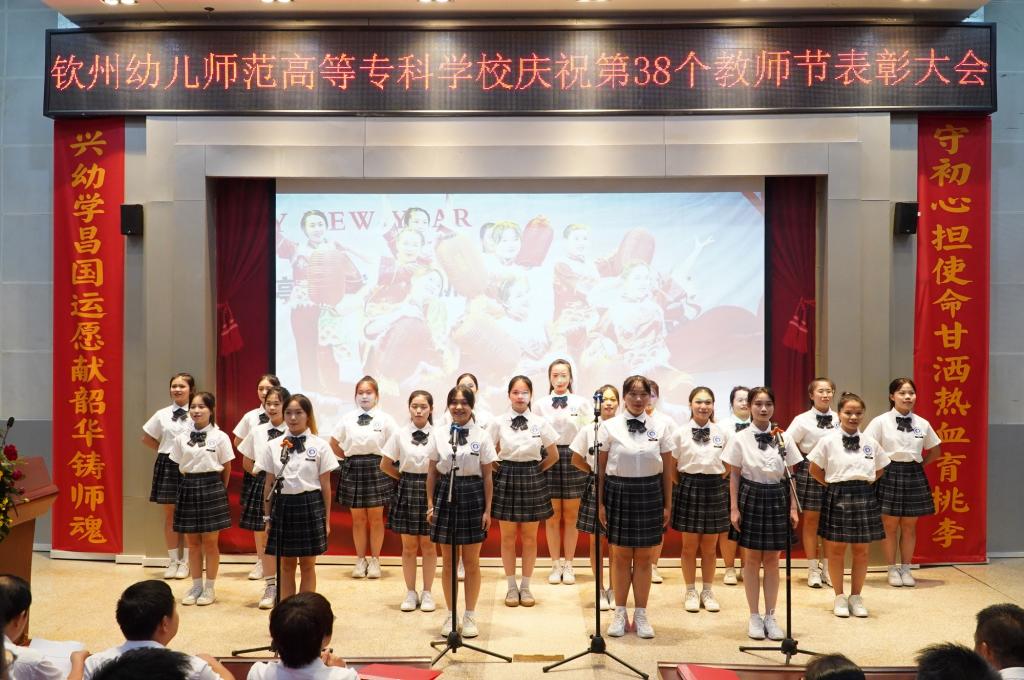 表彰大会穿插了老师们精彩的文艺表演,展现了新时代钦州幼专教师的自信与魅力。李光华、唐丽、归佳莹、徐延峰等老师为大家带来诗朗诵《教师的名义》,感人肺腑的朗诵展示了人民教师伟大的担当和使命。唐书群、班嵘勇、黄青、吴翔等老师为大家带来了歌曲联唱《师恩难忘》,悠扬激昂的歌声在报告厅里久久回荡,唱出了广大教师的心声与力量,增添了浓浓的节日氛围。