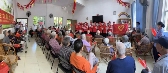 接着,志愿者演唱的经典红歌《没有共产党就没有新中国》引起了老人们的共鸣。最后大家一起合唱《我和我的祖国》,将现场的氛围推向了高潮。