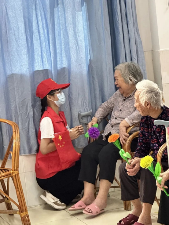 志愿者们贴心询问老人们的健康情况,提醒天气降温注意添衣。心艺手工社团的成员还提前制作了手工花朵送给老人们,传递温暖与爱。志愿者搀扶着老人,散步聊天,享受着秋日午后阳光。