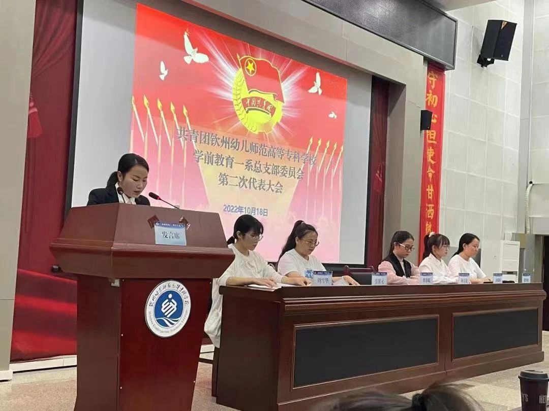 10月18日晚,共青团钦州幼儿师范高等专科学校学前教育一系总支部委员会第二次代表大会在学校五号楼东报告厅召开。学前教育一系副主任覃年升,学前教育二系、艺术与体育教育系和公共管理系团总支负责人,以及学前教育一系74名团员代表出席大会。