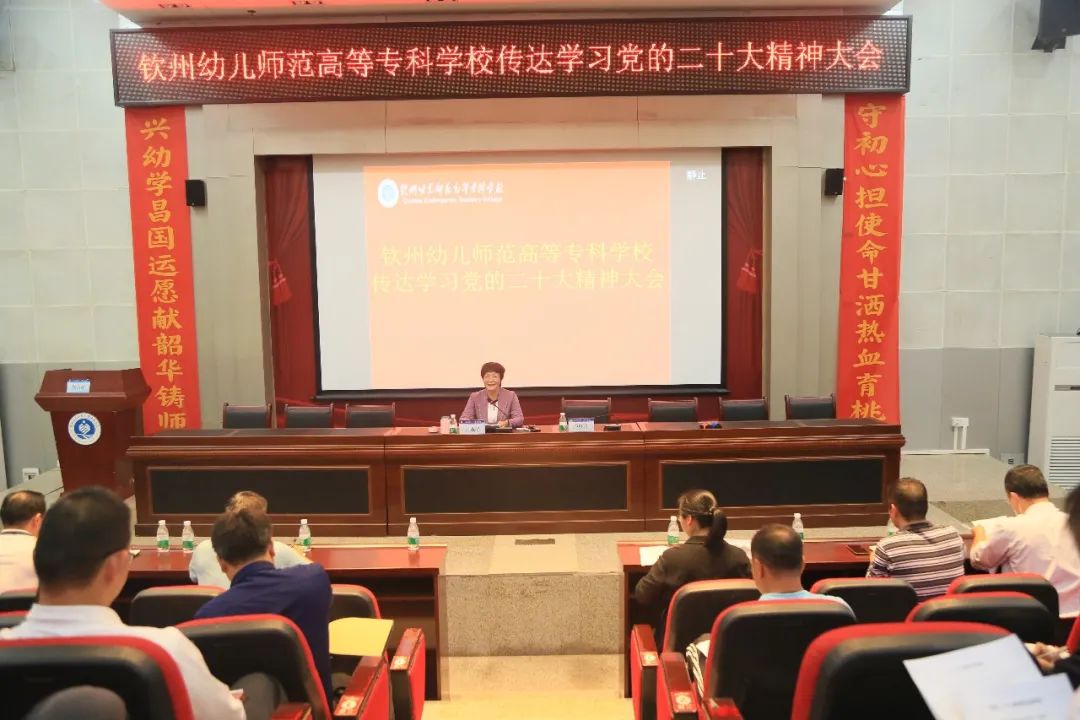 田茂群在报告中阐述了党的二十大的重大意义,讲解了过去五年工作和新时代十年的伟大变革,阐释了习近平新时代中国特色社会主义思想的世界观方法论和新时代新征程党的使命任务,解读了全面建设社会主义现代化国家的目标任务和以自我革命引领社会革命的重要要求。结合学校教育实际,特别与全体参会人员分享了党的二十大报告中关于教育问题的创新理论与新观点,指出加快建设高质量教育体系,办好人民满意的教育,从国家层面来讲,就是与社会主义现代化强国相适应的教育体系,包括高水平的、均等化的基本公共教育服务体系,多样化、个性化、选择性的准基本公共教育服务体系和有利于人人成才的教育治理体系。并就如何做好学习宣传贯彻党的二十大精神有关工作作出部署。她强调,全体党员干部要紧密结合新时代的伟大变革,深刻领悟“两个确立”的决定性意义,增强“四个意识”、坚定“四个自信”、做到“两个维护”,迅速行动起来,深入推动习近平新时代中国特色社会主义思想和党的二十大精神入脑入心,深刻领悟党的二十大报告的精髓要义,牢记习近平总书记的嘱托,把党的二十大精神作为办好人民满意教育的行动指南,撸起袖子加油干,奋力开创新时代钦州幼专发展新局面。