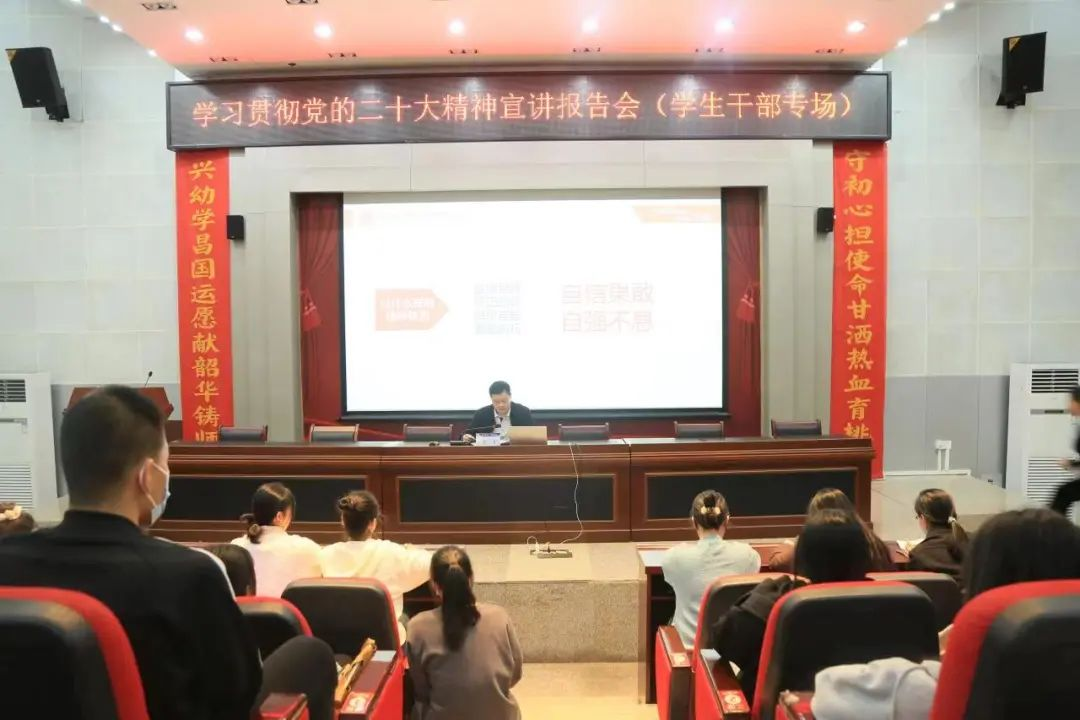11月30日下午,学校党委副书记李飞在学校5号楼东报告厅为我校学生干部做专场宣讲党的二十大精神,全校学生干部到场聆听报告。报告会上,李飞副书记指出,学习宣传贯彻党的二十大精神,是当前和今后一个时期的首要政治任务,要切实增强责任感使命感,把思想和行动统一到中央和自治区党委各项决策部署上来,推动学习宣传贯彻走深走细走实。宣讲报告紧紧围绕党的二十大主题,从党的二十大的重大意义、过去5年的工作和新时代10年的伟大变革、开辟马克思主义中国化时代化新境界等方面,结合典型案例,对党的二十大精神准确宣讲阐释。