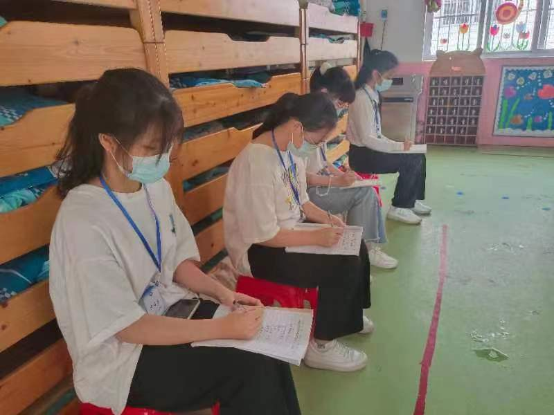 认识实习期间,在带班教师的指导下,学生们快速地融入班级的各项活动学习当中,积极协助组织幼儿开展活动,在区域游戏和户外活动时能和幼儿友好互动,在盥洗时提醒幼儿有序排队,在餐前和睡后活动时带领幼儿进行各种有趣的手指游戏,在幼儿园带班教师开展集体教学时,能认真地倾听和记录。在为期五天的认识实习中,他们主动发现问题、解决问题,将学前教育的理论知识运用到实际的幼儿园生活中,用最灿烂的微笑和最温暖的言行与孩子们拉近了距离。