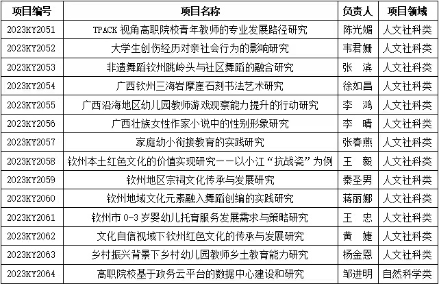 近日,自治区教育厅公布了2023年度广西高校中青年教师科研基础能力提升项目名单,我校教师喜获人文社科类项目13项立项和自然科学类1项立项。以下为立项名单: