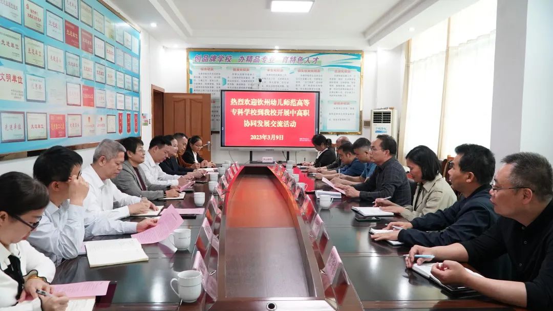 为进一步推进中高职衔接工作,加强中高职一体化贯通培养工作,3月9日,市教育局党组成员、副局长,我校党委书记田茂群一行赴灵山县职业技术学校考察调研中高职协同发展工作并召开座谈会。灵山职校校长方云及班子成员,我校党委副书记、纪委书记李飞,正处级领导干部梁燕清以及相关处室负责人参加座谈。