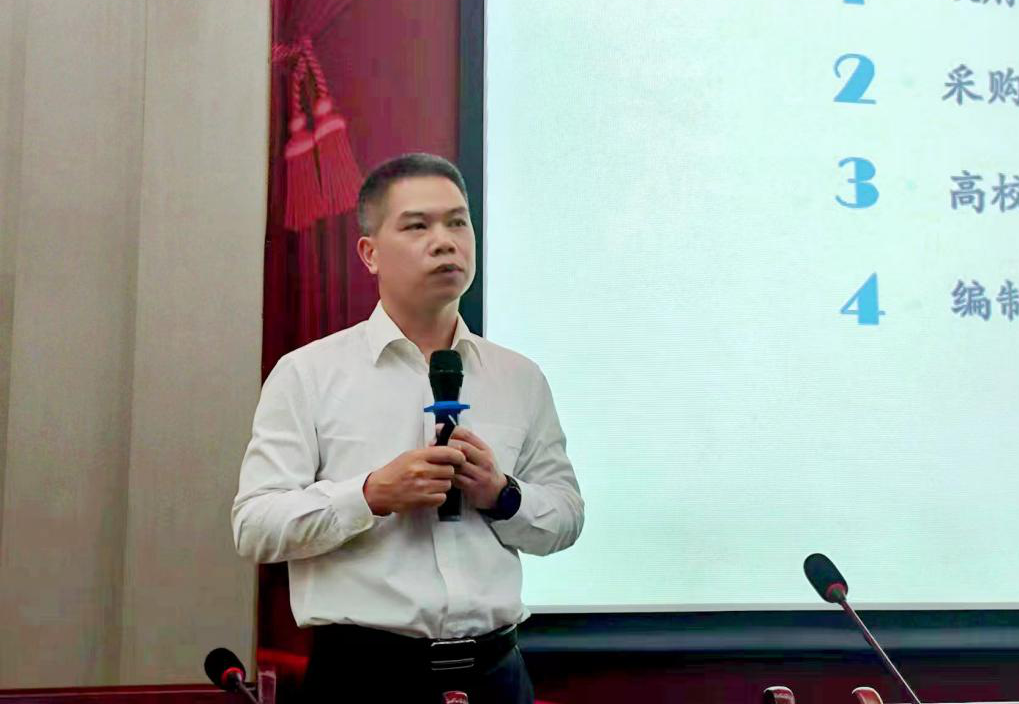 此次培训邀请了云之龙咨询集团副总裁、云之龙学校校长、广西财经学院特聘副教授韦明剑担任授课老师。韦教授围绕政府采购相关法律法规及流程、采购内控制度的实施策略、高校政府采购环节专项审计重点及监督要点、编制需求方案的方法等版块,分享了自己从业20多年来的采购工作经验和个人感悟。