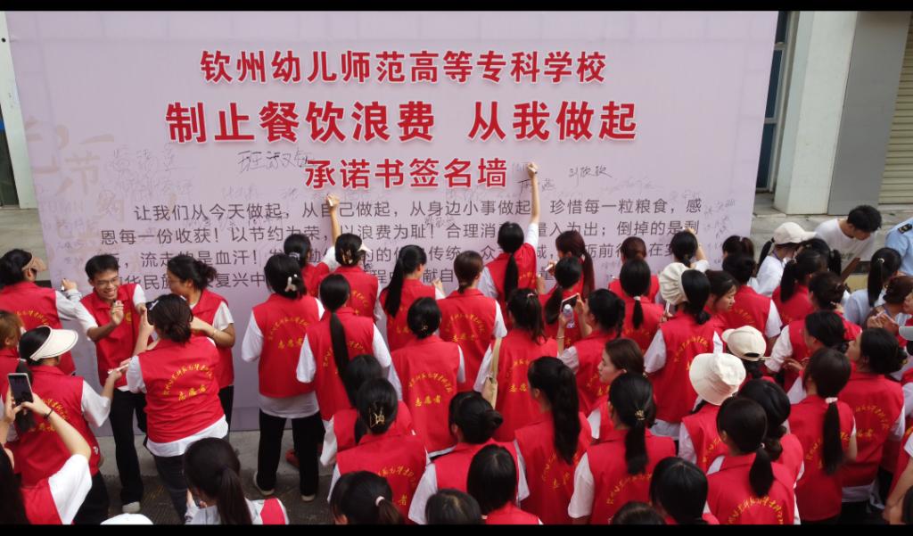 为贯彻落实习近平总书记关于制止餐饮浪费行为的重要指示精神,大力推进制止餐饮浪费专项整治行动的开展,营造“厉行节约、反对浪费”良好社会氛围。5月22日下午,我校联合钦南区市场监督管理局在学校悦享餐饮中心前隆重举行了“制止餐饮浪费 从我做起”的宣传承诺签名活动。钦南区市场监督管理局副局长任峻慷出席活动并作动员讲话。学校党委委员、副校长庄礼训,相关企业代表,学校相关处室负责人,以及各班生活委员、膳管会成员、志愿者共200余人参加签名活动。