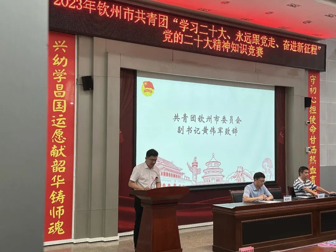 共青团钦州市委员会副书记黄伟军在致辞中指出,知识竞赛的开展,不仅锻炼了各个队伍的团结协作能力,还激发了广大团员青年主动学习党的二十大精神的兴趣,希望参赛选手们以此次知识竞赛为契机,把思想和行动统一到党的二十大精神上来,踔厉奋发,把学习成果转化为实现远大理想的强大动力,为谱写新时代壮美广西建设钦州篇章贡献青春力量!