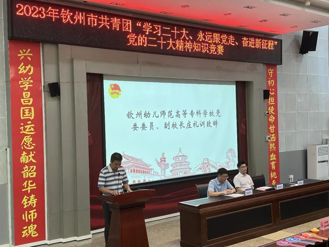 我校副校长庄礼训在致辞中指出,此次活动以知识竞赛的形式引导广大团员青年全面理解、巩固以及运用党的二十大报告阐明的新时代重大理论知识点,有助于凝聚广大团员青年踔厉奋发勇毅前行的力量。参赛选手通过知识竞赛的形式重温了党的二十大报告内容,在党的二十大精神指引下,参赛选手们应该进一步强化政治意识,勤奋学习,为建设新时代新征程新钦州贡献强大青春力量。