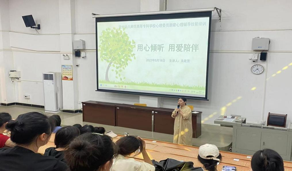 5月18日、 5月26日大学生心理健康中心对各班心理委员进行了朋辈心理辅导培训。关政芳老师以“用心倾听,用爱陪伴”为题,从朋辈心理辅导的现实意义、朋辈辅导技术和工作原则等方面入手,利用案例分析、体验演练等方式深入浅出的讲授朋辈心理辅导的理论知识与实战技术,切实提高心理委员开展朋辈心理辅导的能力,为后续展开实际工作打下良好基础。