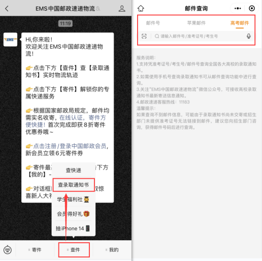 3.进入【邮件查询】-【高考邮件】,输入邮件号/准考证号/考生号查询。