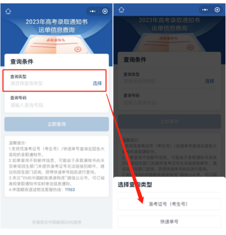 2.可通过选择“查询类型”是准考证号(考生号)或快递单号并输入对应查询号码进行查询。