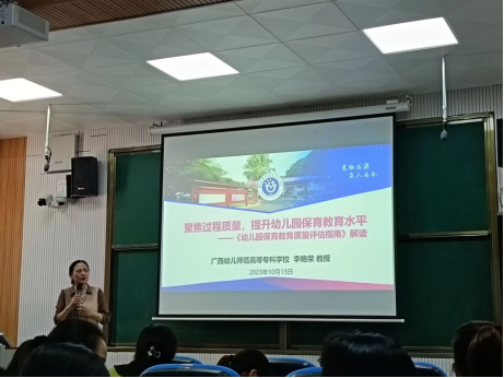 广西幼儿师范高等专科学校李艳荣教授为学员们深入解读了《幼儿园保教质量评估指南》意义、框架和具体内容,并结合案例讲解了在实施《评估指南》的过程中应注意的问题:一是要尊重学前教育的规律和特殊性;二是要处理好与办园行为督导评估的关系。
