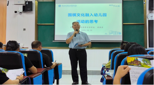 钦州幼专正处级干部梁燕清教授以“围棋文化融入幼儿园活动的思考”为题,从围棋的起源、围棋与人生、围棋与钦州幼专三个方面展开讲解,结合幼儿教师的工作环境和性质,详细介绍了围棋的教育意义,以及如何通过围棋教育让孩子从小爱上思考和学习的策略。