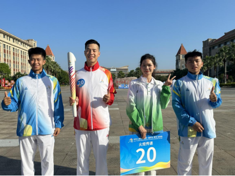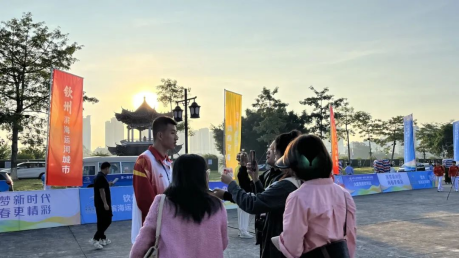 火炬手甘寿宇感言:今天的学青会火炬传递,是我人生中跑得最慢,却很自豪的100米。为了圆满完成本次火炬传递任务,我上网观看了其他赛事相关的火炬传递视频,认真参加彩排演练。特别是在火炬传递的前一晚,反复练习站位、点燃火炬以及交棒后的动作造型。我想在火炬传递中展现新时代大学生的活力与风采,正好前一棒火炬手是来自北部湾大学的大四学生程世发。我们在彩排时商量了好几个动作,最终选择了“雄鹰展翅”的姿势,寓意着青年大学生奋力前进、敢于拼搏,如同雄鹰展翅翱翔一样。作为一名幼儿师范学校体育专业的学生,我毕业后想成为一名小学体育老师。为了更好地锻炼自己,在校期间我报名成为疫情防控志愿服务者、2023环广西公路自行车世界巡回赛钦州段志愿者等,志愿服务时长达500多个小时;在专业知识方面,先后考取了篮球、田径裁判员证书,并担任学校篮球赛、民族传统运动会的裁判员?;鹁娲萁崾?,我收到了很多祝福和鼓励。接下来,我将把参加火炬传递的故事分享给身边的同学以及以后的学生,弘扬体育精神、传播体育力量。