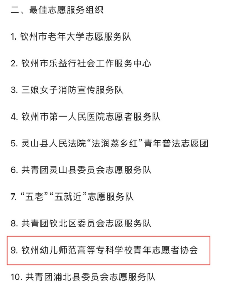 近日,在市文明办组织开展的2023年钦州市学雷锋志愿服务先进典型评选活动中,钦州幼儿师范高等专科学校青年志愿者协会获评“2023年钦州市最佳志愿服务组织”。