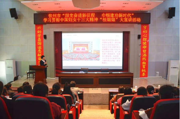 为深入学习贯彻习近平总书记同全国妇联新一届领导班子成员集体谈话时的重要讲话精神和中国妇女十三大精神,11月21日上午,中国妇女十三大代表,自治区妇联副主席、党组成员梁春花到钦州幼儿师范高等专科学校开展“跟党奋进新征程 巾帼建功新时代”——学习贯彻中国妇女十三大精神“桂姐姐”大宣讲活动。市妇联党组书记、主席符进春主持活动。钦州幼儿师范高等专科学校党委副书记、纪委书记李飞及在校师生代表200多人参加活动。