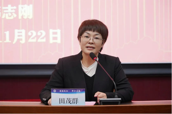 Δ市教育局党组成员、副局长,校党委书记田茂群主持讲座