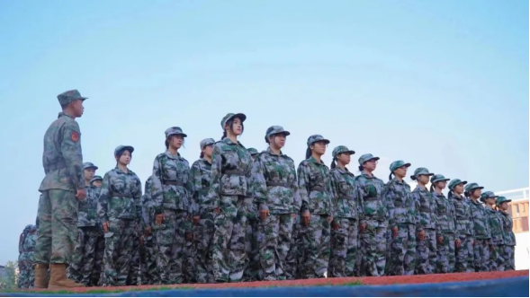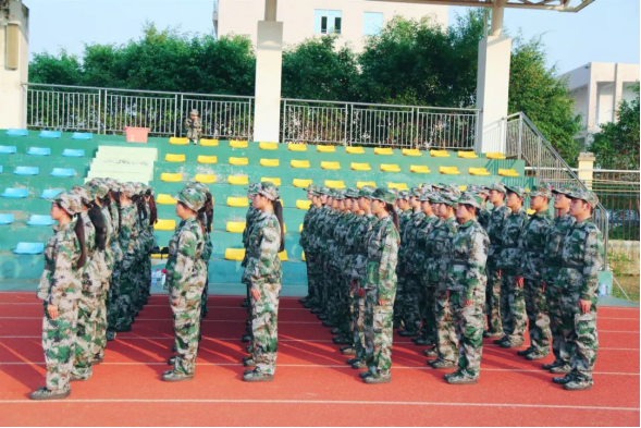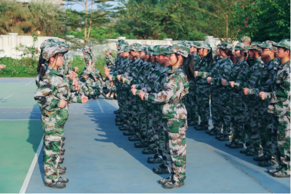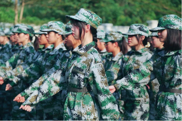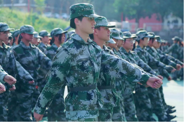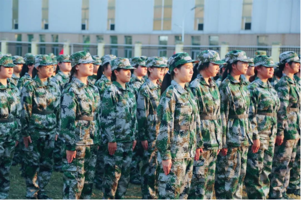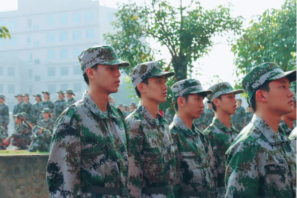 稍息!立正!同学们身着迷彩戎装站着挺拔的身姿昂起坚定的眼神勇往直前以青春的号角迎接军训的挑战