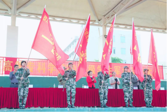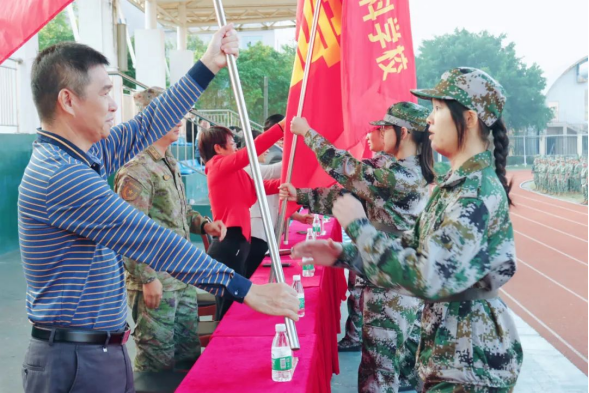 军训团旗随风飘展,学校领导手握团旗郑重交接给参训学生代表,完成授旗仪式。