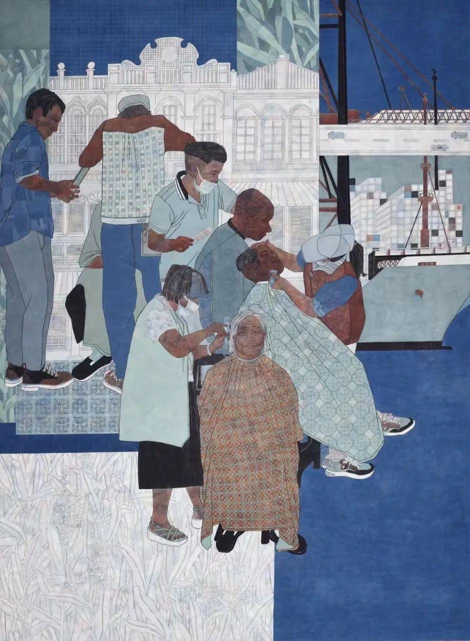 《滨城·新颜》这件作品表现的是作者生活工作的地方——广西壮族自治区钦州市,一座位于南方沿海的小城,是岭南文化、“广府文化”重要的兴盛地、传承地之一。这里有抗法英雄刘永福、冯子材故居,保存完好的骑楼老建筑,中国西部唯一的保税港区,滨海风景,丰富的热带、亚热带花卉植物,四大名陶——坭兴陶,都为作者的创作提供了丰富的素材。作者一直都想创作一件表现当地发展,有地方特色的作品。去年夏天,作者在骑楼老街采风时,刚好遇到社区志愿者开展志愿服务活动,由于疫情期间很多老人理发不方便,志愿者们进社区为老人们免费理发,看到这个场景特别有感触,回去后便开始构思画面,决定把这滨城的新颜表现出来。