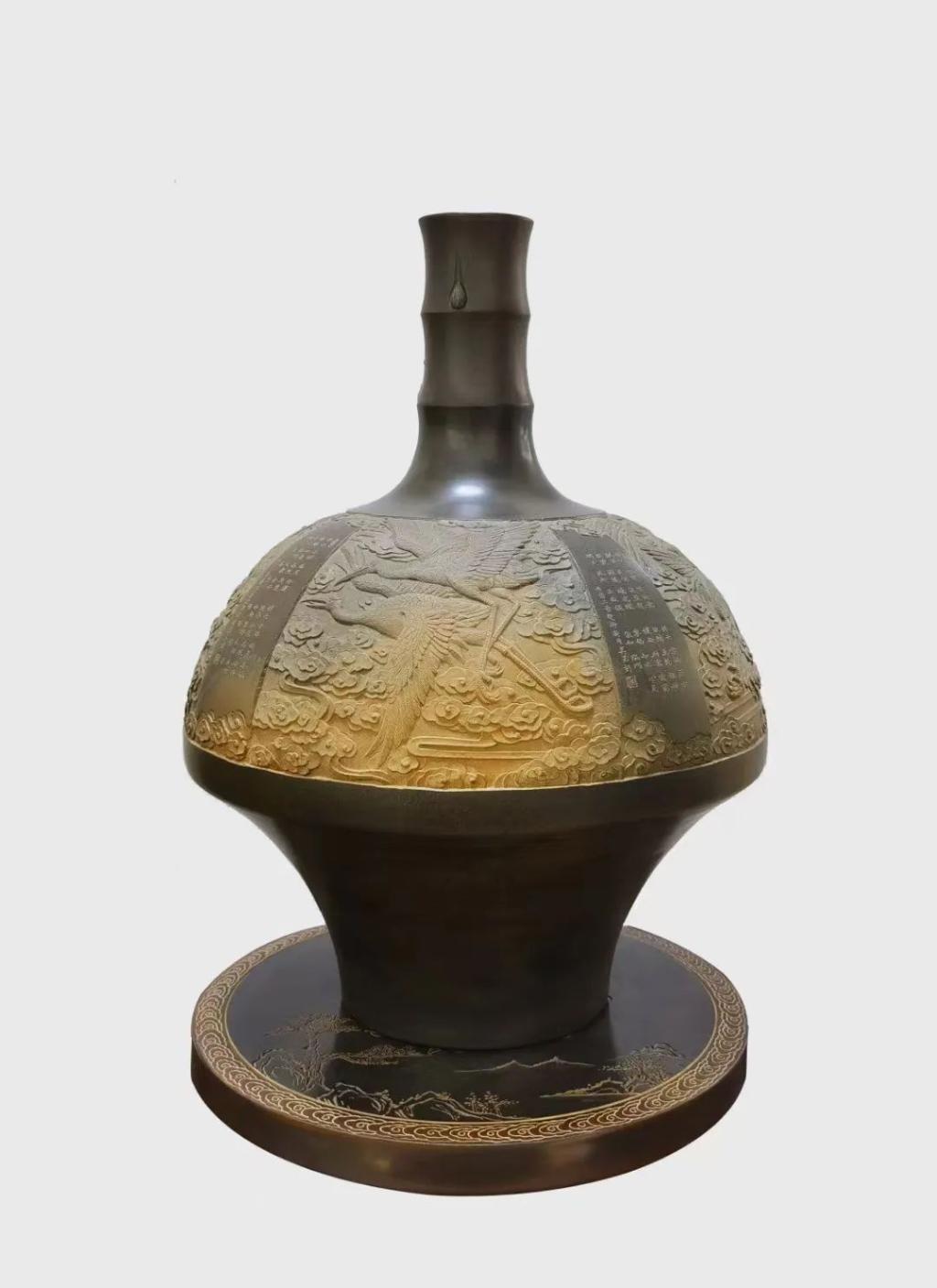 《瑞鹤凌云》作品以拉坯为主要成型方式,瓶颈辅以秀竹贴花装饰,瓶身以浮雕的手法雕刻了晴空万里,群鹤两两结对,推开云层,直冲云霄的景象,另外,还采用祥云诗词楷书雕刻丰富装饰层次,给人一种励志冶情的美好感受。