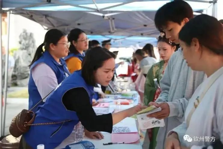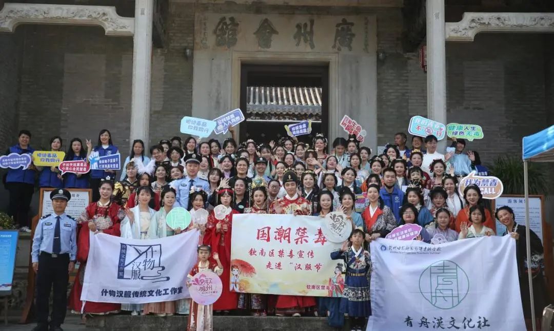 百人巡游、汉服走秀、传统趣味游戏.....让市民感受传统与禁毒的碰撞,倾听历史与禁毒的对话。11月25日汉服节当天,钦南区禁毒办与钦州汉服社、文峰街道、文峰派出所、什物汉服传统文化工作室、钦州幼专青舟汉文化社联合开展禁毒宣传活动,把禁毒宣传与“国潮文化”结合,让“警服”与“汉服”穿越时空共话禁毒。