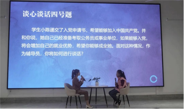经过基础知识笔试,共有10位选手进入决赛。决赛包括案例研讨和谈心谈话两个环节。案例研讨主要考察辅导员综合运用理论分析问题、研判问题、解决问题的能力。谈心谈话主要考察辅导员对学生特征、学生成长成才规律的了解把握程度,对学生的教育引导能力、解决理论困惑和实际问题的能力等。