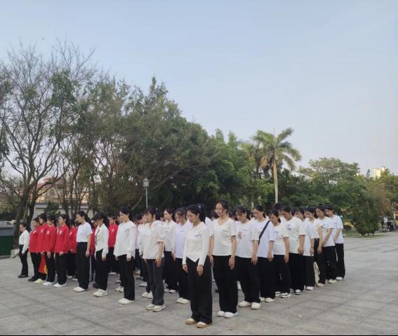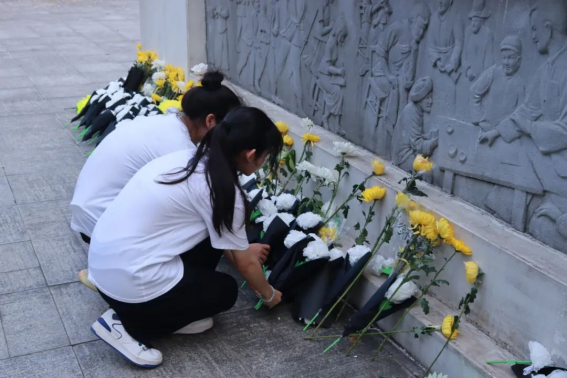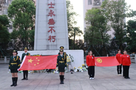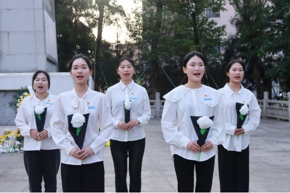 革命烈士纪念广场肃穆庄重,烈士碑上“革命烈士永垂不朽”八个大字熠熠生辉。国旗护卫队队员们踏着整齐的步伐,护卫着五星红旗向烈士碑迈进,向革命烈士纪念碑敬献花篮。在革命烈士纪念碑前,全体师生齐唱国歌、低头默哀、敬献由学前教育学院学生制作的手工花朵,缅怀为新中国的成立而流血牺牲的烈士们,向英烈们致以崇高的敬意。