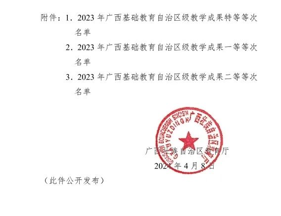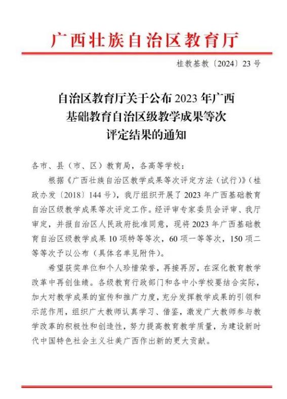 根据《自治区教育厅关于公布2023年广西基础教育自治区级教学成果等次评定结果的通知》(桂教基教〔2024〕23号)文件精神,我校在2023年广西基础教育自治区级教学成果奖评选中取得了优异成绩。其中,我校作为第一主要完成单位,由李小敏老师牵头完成的教学成果《觉知文化,涵育素养:普通高中技术课程思政育人的探索与实践》获评二等等次。我校作为第二主要完成单位,由卢红青、曾霄令、谢月等3位老师与校外教学团队共同参与的教学成果《基于生命情感教育的幼儿园“绘本戏剧”课程的探索实践》获评二等等次。