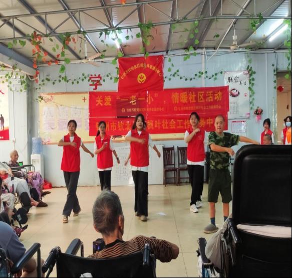 随后,志愿者为老人们呈献了一场精彩纷呈的文艺演出。手势舞《感恩的心》温馨地拉开了演出的序幕,志愿者们献唱歌曲《真的爱你》、《大中国》、《国家》,表演舞蹈《采桑谣》、《酒醉的蝴蝶》、《桃花朵朵开》,精彩的表演赢得了现场观众阵阵掌声。表演期间,志愿者还与老人们开展互动小游戏,现场一片欢声笑语。