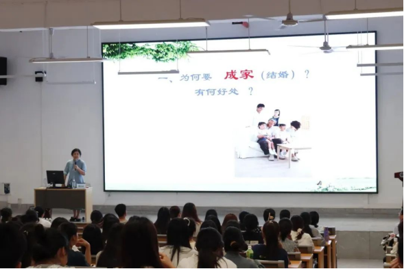 活动邀请了广西婚姻家庭研究会副会长、国家婚姻咨询师、广西家庭教育研究会理事滕洁贞授课。滕洁贞老师以《树立正确婚恋观,走好人生幸福路》为主题,从为何要成家(结婚)、有何好处,如何选择伴侣,怎样让你爱的人爱上你,如何与你爱的人相处等方面,以深入浅出的理论讲解、生动有趣的现场演示以及互动性强的答疑解惑环节,引导学生合理表达内心情感,加强对新型婚育文化的了解,引导他们在面对婚恋情感问题时能够理性思考。