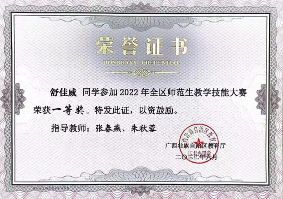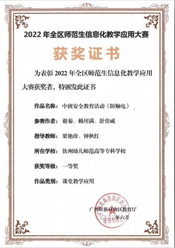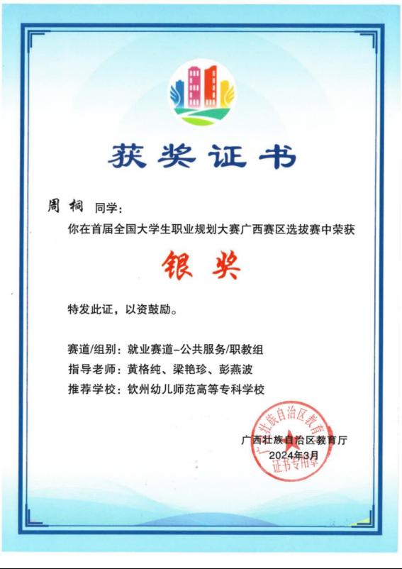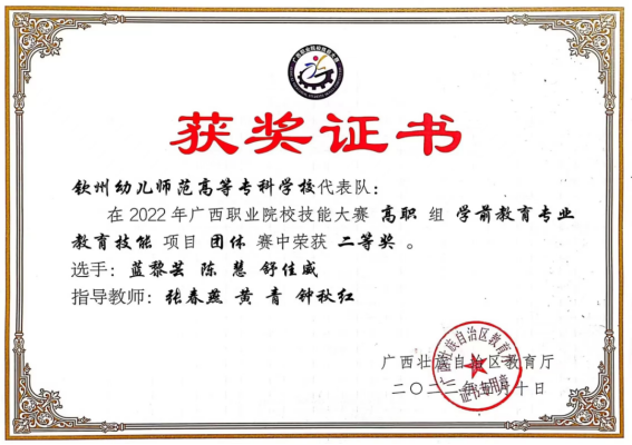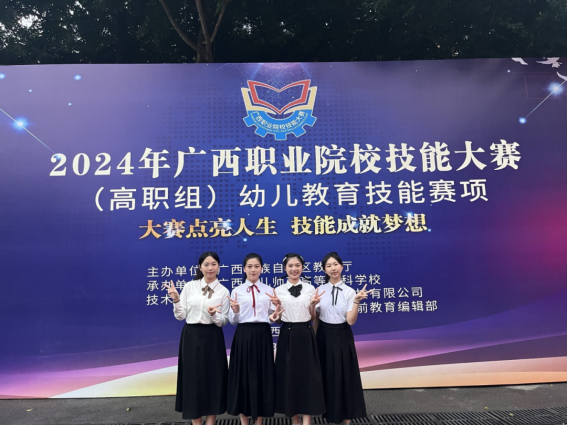 学生在各级各类技能大赛荣获省级以上奖项30余项。先后荣获第九届中国国际“互联网+”大学生创新创业大赛“数广集团杯”广西赛区选拔赛铜奖、首届大学生职业规划大赛广西赛区选拔赛银奖、2022年全区师范生信息化大赛一等奖、2023年“幼之幼杯”全国学前教育专业知识与技能竞赛全国一等奖、2024年广西职业院校技能大赛(高职组)幼儿教育技能赛团体赛一等奖、2022年和2024年全区师范生教学技能大赛一等奖、2024年第三届广西壮族自治区学生运动操舞锦标赛自选啦啦操冠军等。